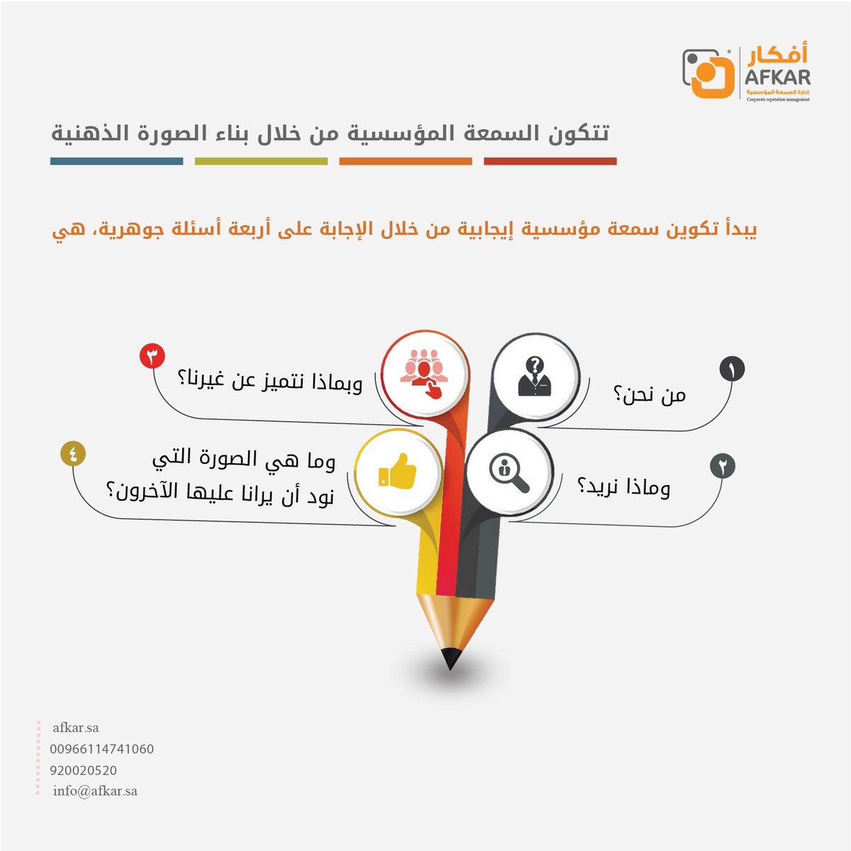 أفكار لإدارة السمعة On Twitter تتكون السمعة المؤسسية من خلال بناء الصورة الذهنية يبدأ تكوين سمعة مؤسسية إيجابية من خلال الإجابة على أربعة أسئلة جوهرية هي 1 من نحن 2 ماذا نريد 3 بماذا نتميز