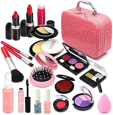 مجموعة أدوات المكياج التظاهرية من سينروكس مجموعة مكياج مطاطية لعب وهمية مع حقيبة مستحضرات تجميل للبنات لعبة آمنة وغير سامة هدية عيد ميلاد للفتيات من سن 4 10 سنوات تناسب لعب الأدوار فستان