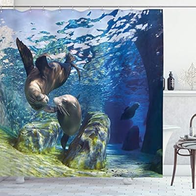 مجموعة ستائر الحمام Ambesonne Sea Animals Decor Decor لعبة أسد البحر كاليفورنيا المرح السباحة في مياه نقية تحت البحار العالم اكسسوارات الحمام 69 عرض 70 طول كحلي ليموني Amazon Ae