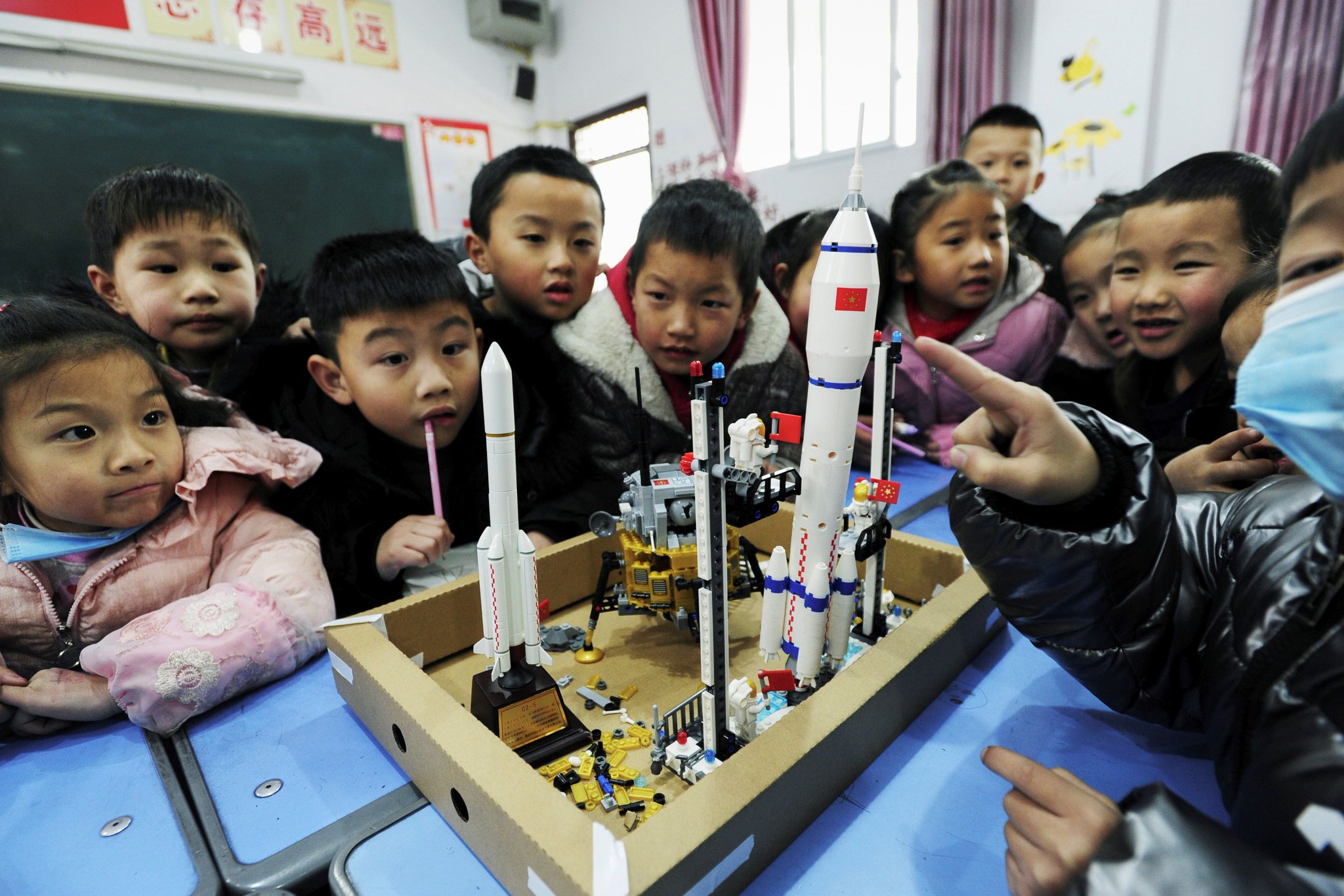 صحيفة الاقتصادية صور أطفال ينظرون إلى نموذج لصاروخ خلال درس تعليمي بمجال الطيران في الصين أ ف ب