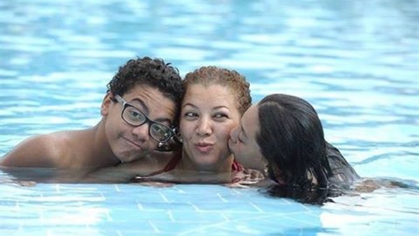 صورة الفنانة إنتصار مع ابنائها في حمام السباحة المدينة نيوز