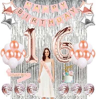 لوازم الحفلات 16 ديكورات عيد الميلاد السادس عشر مع بالونات بلون الذهب الوردي لافتة عيد ميلاد سعيد 16 قطعة علوية للكعك كونفيتي ذهبي وردي وشاح سويت 16 ديكورات ستة عشر للبنات Amazon Ae