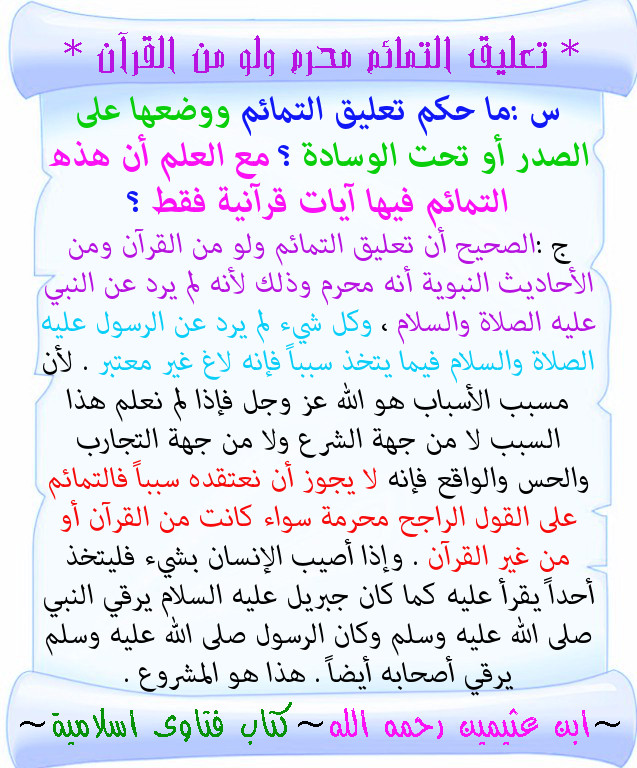 حكم تعليق التمائم من القران لابن عثيمين تصميماتي الدعوية منتديات الإمام الآجري