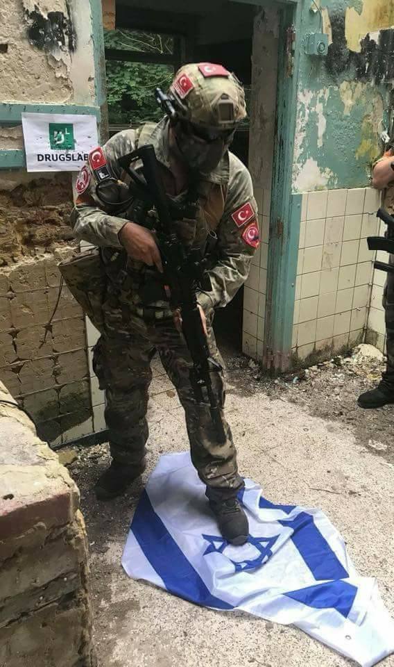 48 الإخبارية Na Twitterze صورة منتشرة على أنها لجندي تركي يدوس بقدمه علم إسرائيل بعد معارك بين الجيش التركي وقوات كردية في سوريا