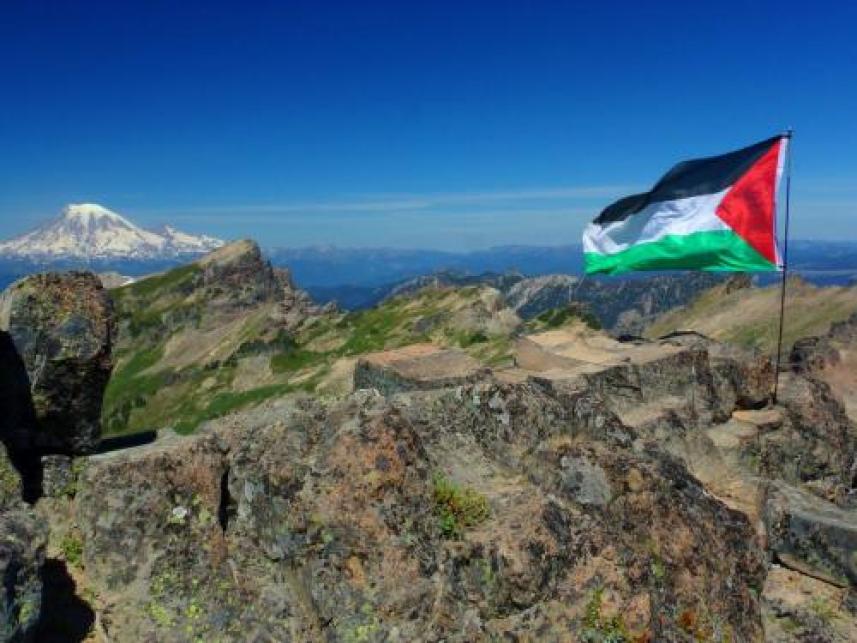 وكالة القدس للأنباء المتسل ق سكوت وولف يرفع علم فلسطين على جبال واشنطن الأمريكية